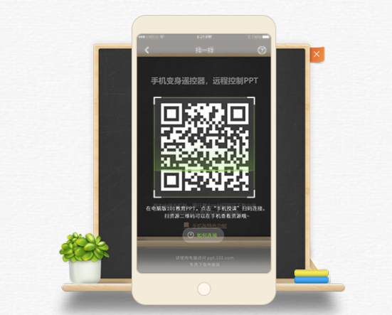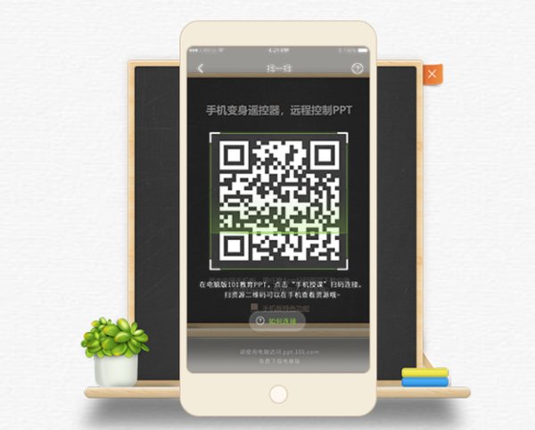 3、这时,打开你手机上的101教育PPT应用,点击屏幕底部的“扫一扫”功能,对准电脑上的二维码扫一下,就连接成功了。