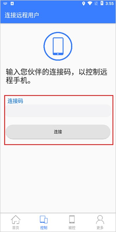 2、现在,我们来看看怎么主动去控制别人的设备。在主界面上找到“控制功能”相关的区域,你会看到一个输入框,提示你输入“连接码”。让你的朋友或者家人在他们的手机上打开同一个app,找到并告诉你他们的连接码,你把那串数字输入到这里,点一下连接,稍等片刻,就能看到对方的手机屏幕啦。