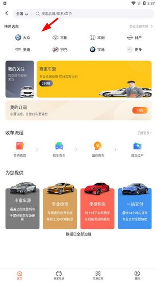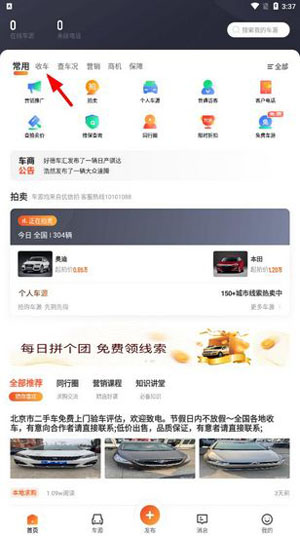 1.打开应用后,你的第一步就是明确目的。比方说,如果你想淘车,就需要先在首页上方将标签切换到【收车】。