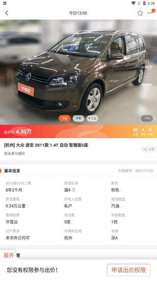 5.点击进入车辆的详情页面后,你就可以看到更详细的信息,如果满意,就可以直接出价参与拍卖了。