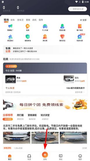 1.想要发布车源信息其实很简单,在应用主界面的最下方,你会看到一个大大的【+】号,点击它。