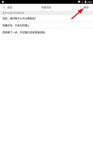 3.进入快捷消息列表后,点击右上角的【编辑】按钮。