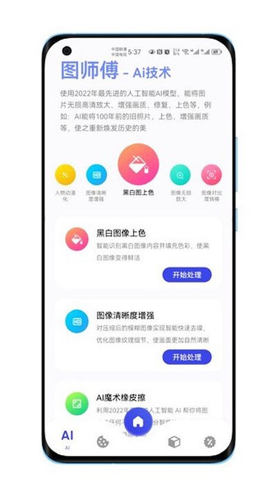 更值得一提的是它强大的AI智能处理模块。老照片模糊不清?可以用AI增强清晰度。黑白照片想变彩色?AI一键上色功能或许能给你惊喜。照片里有路人或者不想要的水印?AI橡皮擦和AI去水印功能就能派上用场,处理效果相当自然。甚至还能对图像进行无损放大,解决图片分辨率不足的烦恼。