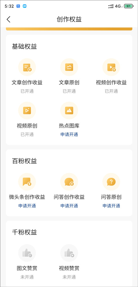 3、在创作权益页面里,你能看到各种不同等级的权益,比如基础权益、百粉权益、千粉权益等等。刚开始玩的话,我们只能先从最基础的权益入手。