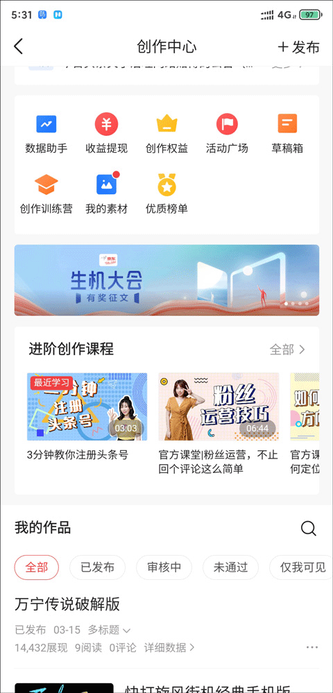 1、还是在“我的”页面里,找到“创作中心”并点击“进入”按钮。跳转到创作者页面后,留意一下右上角有个“发布”的图标,点它。