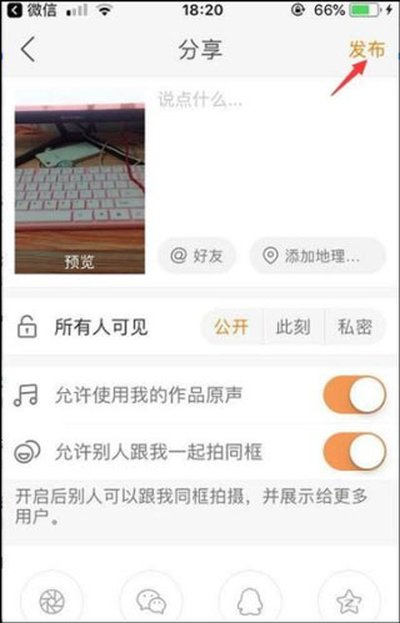 4、现在你的作品已经基本完成了,只需要在右上角点击“发布”,你精心拍摄的视频就会被分享出去。当然,在发布前你也可以在下方对观看权限等进行设置。