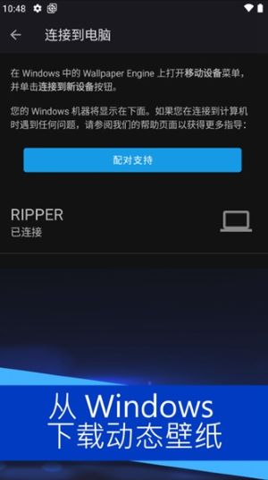 第2步:接着,在你的安卓手机上打开Wallpaper Engine应用,点击右下角的“添加”按钮。在菜单里选择“与计算机配对”,这时你的电脑应该会出现在设备列表里。选中你的电脑,并输入刚才在第一步里看到的那个4位数PIN码。