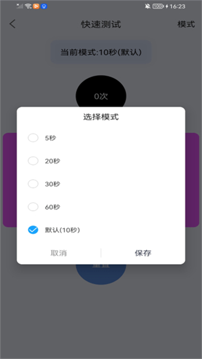 2、快速测试页面中,点击右上角模式,打开测试时长选择弹窗。