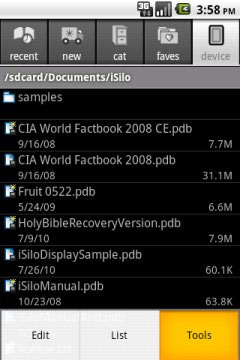 3、当iSilo的主界面出现后,你需要按一下设备上的“菜单”键(通常是实体按键或屏幕下方的虚拟按键),这时会弹出应用的菜单,请在菜单里选择“工具”(Tools)选项。