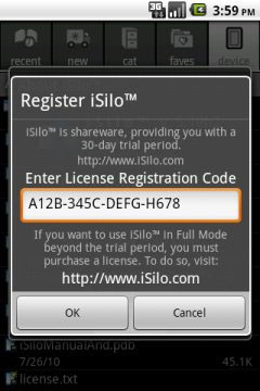 6、现在就到了最关键的一步了。在弹出的“注册iSilo”对话框里,准确输入你购买授权后收到的那串注册码。输入完毕后,仔细核对一下确保没有输错,然后点击“确定”(OK)。请注意,显示的注册码只是个例子,并不是有效的,你必须输入自己收到的那一串才行。