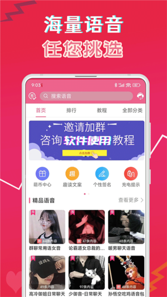 汇集了数十万条由真人录制的甜美语音素材,覆盖了群聊、私聊、游戏、撒娇等多种场景,无论是吃鸡、萝莉、大叔还是御姐、清唱、伪音,总有一款能戳中你。