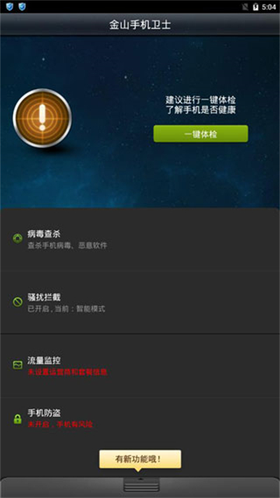 1、在金山手机卫士首页,点击一键体检,可快速检测手机整体健康状态。