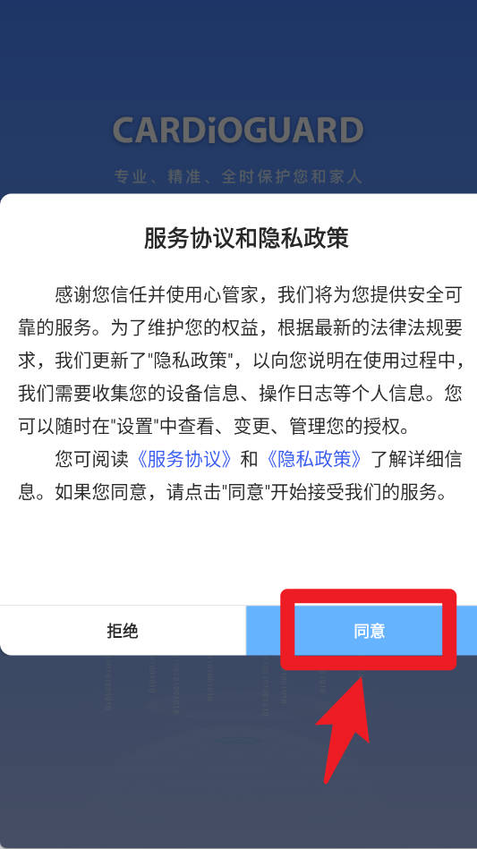 1、第一次打开应用,会先看到服务协议和隐私政策,仔细阅读后点一下“同意”就可以继续下一步操作了。