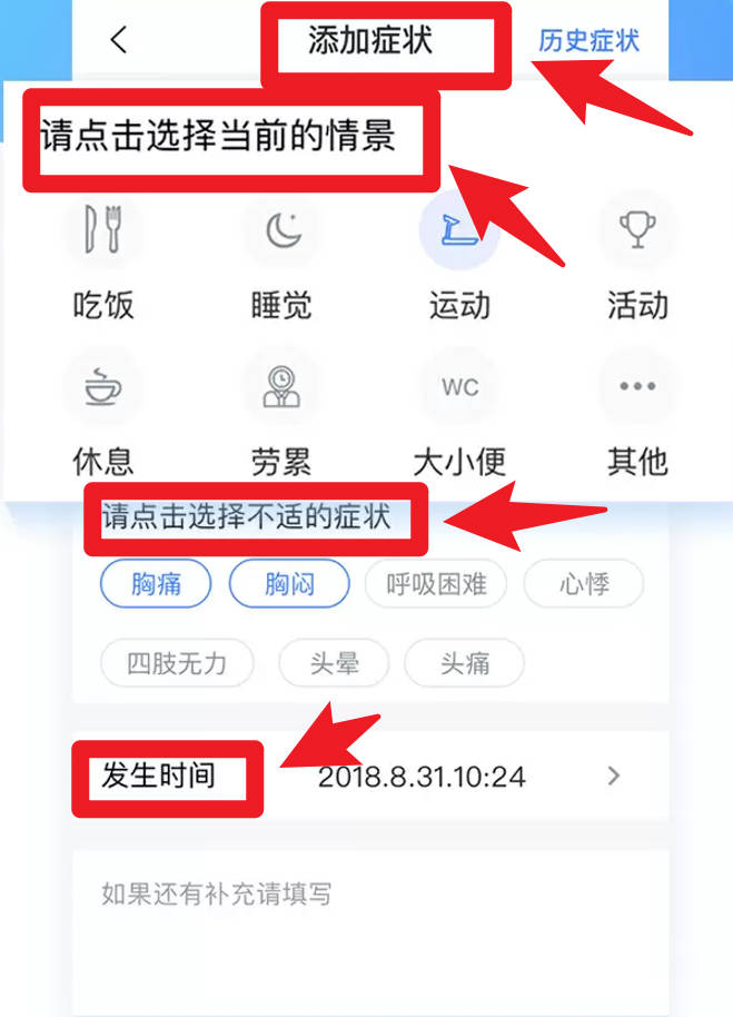 3、当身体感到不适时,可以在添加症状的页面进行记录。先根据当时的情景选好标签,再勾选具体的症状,并且把事情发生的时间也填上,方便日后回顾。