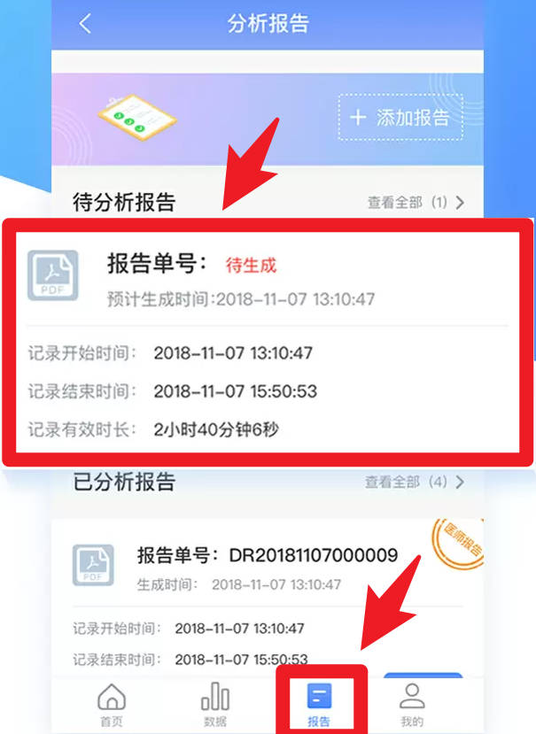5、应用会为你整理健康报告,在这个界面里,你可以查看到正在生成中和已经完成的所有报告。每份报告都会清楚地标明记录的起止时间和有效数据时长。