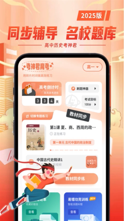 高中历史是考神君系列专攻历史学科的辅导工具,同步校内知识体系,整合高考常考题型与历史专题集锦,覆盖中外全阶段历史内容,搭载视频讲解错题本题库三大核心板块,全方位提升学习效率,适配高考备考全阶段使用需求。