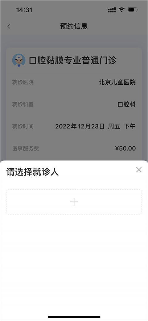 4、接下来,系统会让你选择为哪位家庭成员挂号。如果你是第一次使用,这里会是空的,需要你先添加就诊人信息。