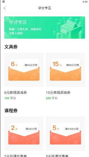 4. 在【学分专区】中,我们可以用积累的学分来换取各种实用的礼品,比如用100学分就能兑换一张6元的课程满减券。