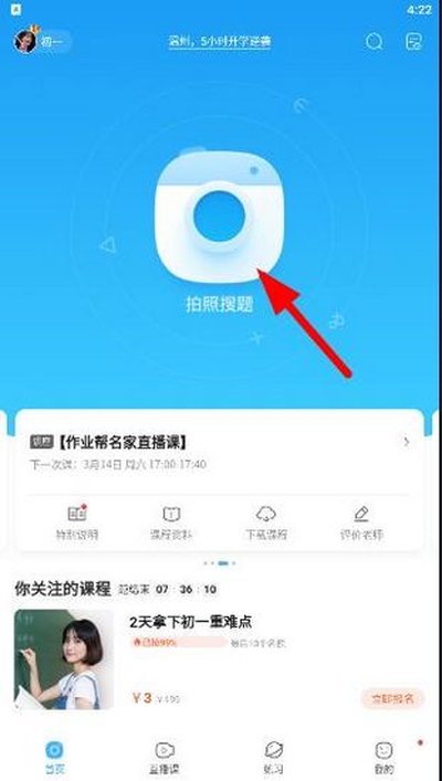 1. 登录应用后,点击主界面中间靠下位置的拍照图标,选择“拍照搜题”。