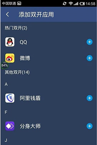 很简单,在软件的主界面上找到并点击“+”号,然后从列表里把你想要开小号的应用(例如微信)添加进来就行了。