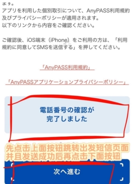 2、当页面跳转到p3时,先点击上方红圈里的按钮。系统会自动跳转到p2页面去发送一条短信,发完后,再切回AnyPass应用,点击下方红圈里的按钮继续。