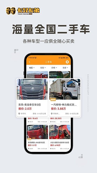 1、首先在手机上找到并打开卡兄卡弟这个应用,进入后可以依据你车辆当前遇到的具体问题,来选择对应的服务项目。