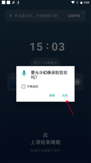 3、接下来,应用会向你请求使用手机麦克风的权限,因为记录梦话和鼾声需要用到录音功能。为了让它能正常工作,你需要同意并开启这个权限。