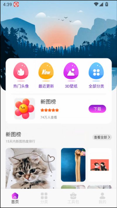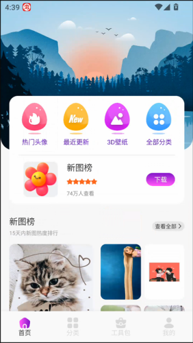 1、一进入应用的主界面,各种精彩内容就扑面而来。你可以直接在这里逛逛时下最火的头像,看看最近上新了哪些美图,或者探索一下酷炫的3D壁纸和所有图片的详细分类,寻宝之旅就从这里开始。