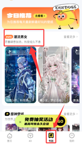 3、 应用里还有一个特别值得逛逛的板块,那就是“今日推荐”。每天这里都会有一个醒目的橙黄色横幅,告诉你今天又上新了哪些宝贝壁纸。横幅下面还有更细致的主题分区,像是“Hot 潮流男女”或者“原神壁纸”等等,帮你把时下最流行的元素都整理好了,让你总能走在潮流前线。