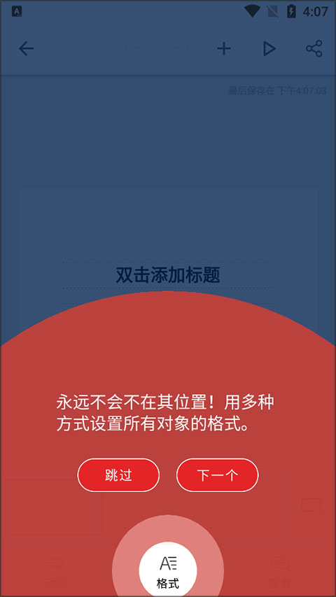 8、点击“格式”按钮,可以调出多种设置选项,让你能够对幻灯片上的所有对象进行格式化调整。