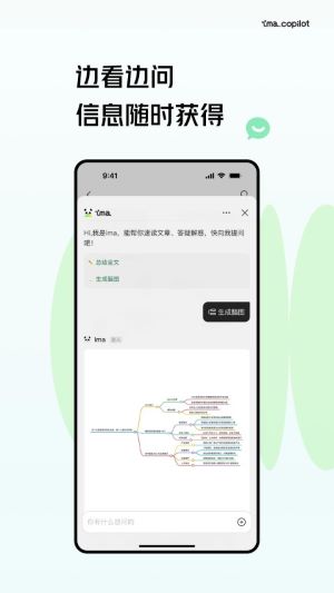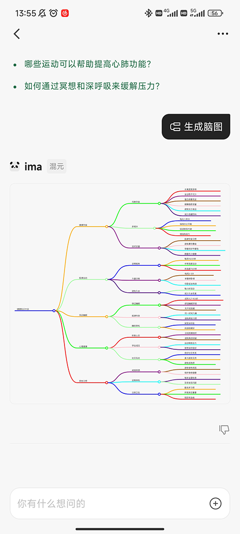 当你和ima聊完一个复杂的话题,想要更直观地梳理思路时,可以试试这个功能。在对话界面下方的工具栏里找到“生成脑图”的按钮,或者直接告诉它“生成脑图”,它就能立刻把当前的对话内容变成一张结构清晰的思维导图。