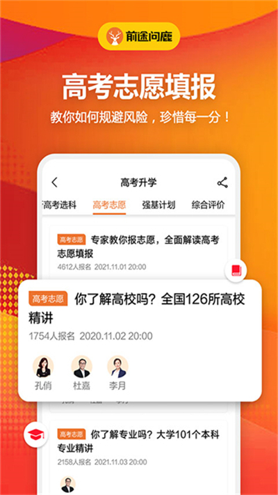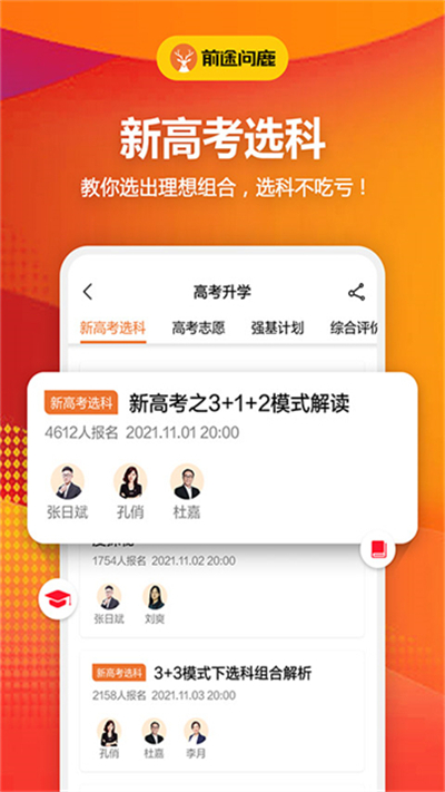 前途问鹿app是会员制生涯发展学习平台,服务年龄段覆盖15至24岁群体,围绕升学、深造、考证、就业搭建完整服务体系,平台紧跟新高考政策走向,开设选科直播与一对一专家指导,志愿填报由专业团队远程协助,结合大班授课与个性化辅导,最大化分数价值,定制专属升学与发展路线。