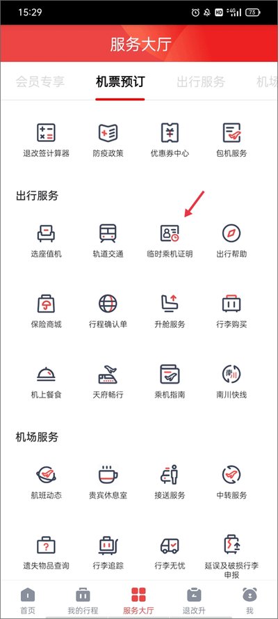 (1)万一出门匆忙忘了带身份证,也别慌。先去App底部的“服务大厅”。里面功能特别多,在“出行服务”那一堆里,就能找到“临时乘机证明”的入口。