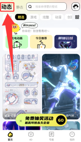 1、 刚打开应用,首先映入眼帘的就是它的主界面,默认展示的是酷炫的动态壁纸。如果你想换换口味,看看静态图片,只需要点击顶部的标签就能轻松切换。顶部还有一个搜索框,想找什么特定主题的壁纸,直接输入关键词就行。界面下方还贴心地为你准备了精选、游戏、炫酷这些热门分类,方便你快速浏览。