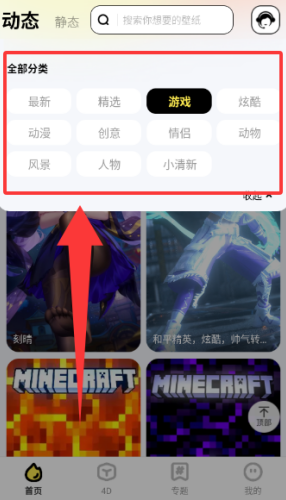 2、 如果想更精确地找到自己喜欢的风格,可以点进“全部分类”页面。这里就像一个壁纸的宝库,各种标签一目了然。比如你是个游戏迷,直接点击“游戏”标签,所有相关的壁纸就会被筛选出来,当前选中的标签会高亮显示,非常直观。如果觉得分类列表太长,点一下“收起”按钮,它就会整齐地折叠起来。