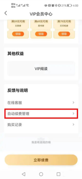 3、在【VIP会员中心】页面里,一直向下滑动到最底部,找到【反馈与说明】一栏,然后点击下方的【自动续费管理】。