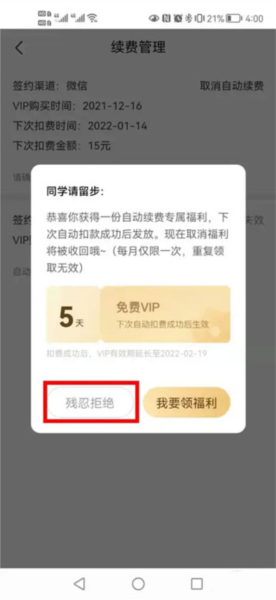 6、为了挽留用户,系统可能会弹出一些优惠信息,不用理会,果断选择【残忍拒绝】即可。如果将来有需要,随时可以再次开通VIP,但记得开通后按照同样的步骤把自动续费关掉。
