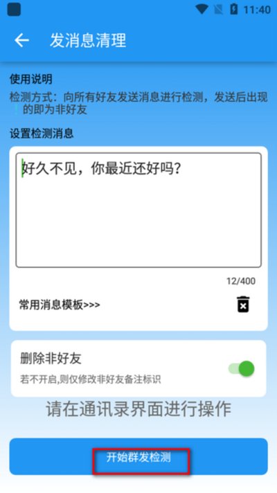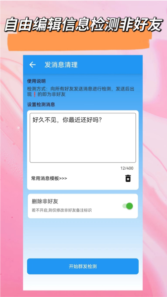 你可以预先编辑好一条用于检测的消息,然后通过应用一次性发送给所有好友,极大地节约了你的宝贵时间。