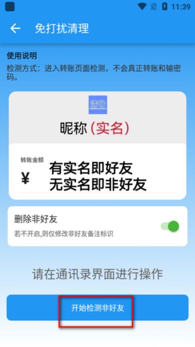 1.进入免打扰清理功能,然后点击“开始检测非好友”按钮。