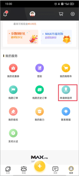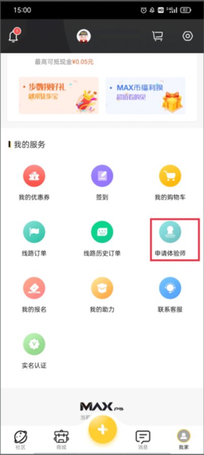 1、首先需要进入到【我的】这个主菜单,然后在“我的服务”板块里找到并点击“申请体验师”的选项。
