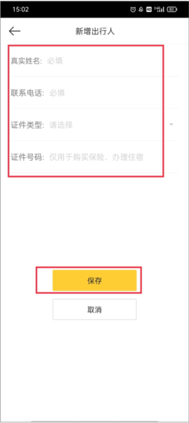 4、在对应的栏目里,准确输入出行人的真实姓名、手机号码以及证件号码,检查无误后,点击最下方的保存按钮即可完成添加。