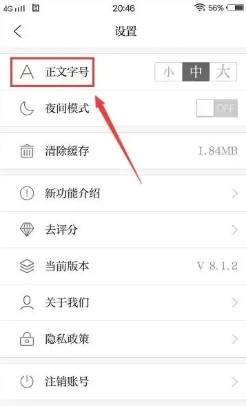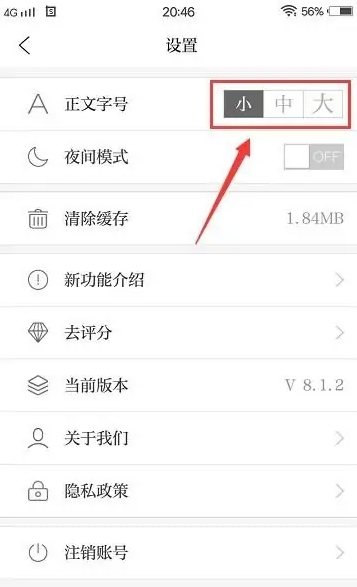 在这里,你可以根据自己的阅读习惯,点选“小、中、大”三种字号中的任意一个来调整字体。