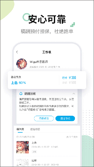 3、米画师app官方最新版本会对交易进行全程担保。只有当你收到满意的稿件并点击确认后,平台才会将稿酬支付给画师。