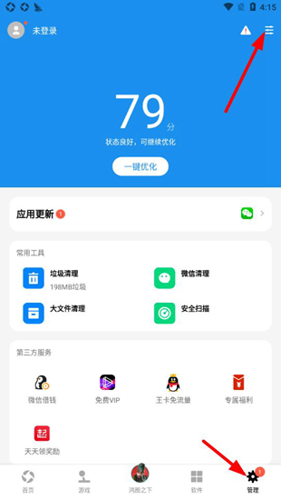 1. 第一步,你需要先进入软件的【管理】界面,然后留意一下右上角,会看到一个由三条横线组成的菜单图标,点击它。