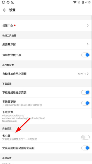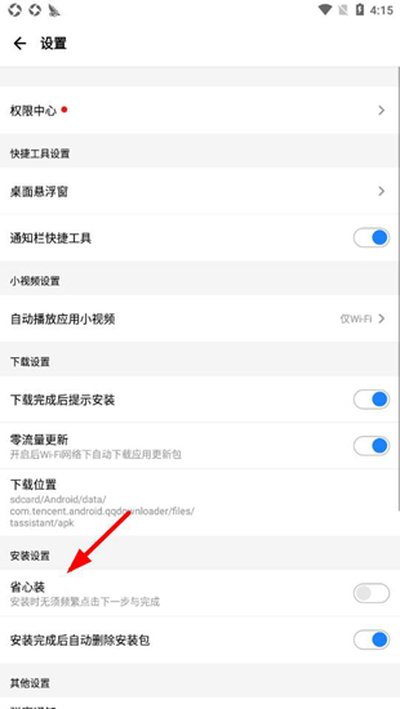 2. 点击之后,在弹出的选项里就能找到一个叫【省心装】的功能。你只要把这个功能的开关打开,之后再下载任何软件,它都会在下载完成后自动帮你搞定安装过程,省去了手动点击确认的麻烦。