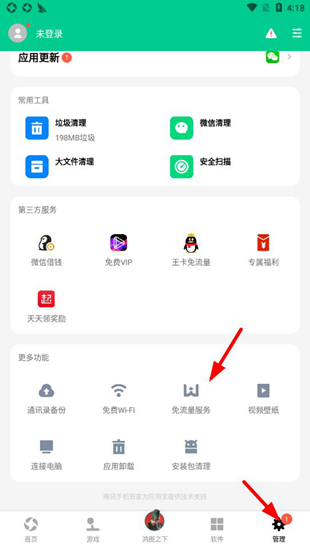 1. 首先,还是得先去【管理】这个功能区,在里面的众多选项中找到并选择【免流量服务】这一项。