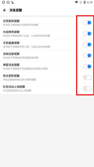 2. 进入【消息提醒】的管理页面后,你会看到各种提醒类型的开关。这时候,你只需要根据自己的需要,把那些不想收到的提醒逐一关闭就可以了,还你一个清净的通知栏。