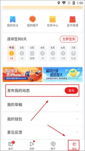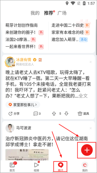方法二:打开并登录应用后,点击底部的【圈子】导航按钮,进入圈子页面后,轻点右下角的【+】号图标,即可开始发布你的动态。