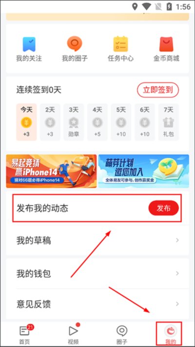 方法一:启动并登录网易新闻头条版应用,切换到右下角的【我的】标签页,然后在页面中找到并点击【发布我的动态】选项。