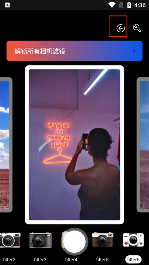 1、打开App,你就会看到琳琅满目的胶卷滤镜。选一个你心仪的款式,然后按下中间的快门按钮,一张充满复古感的照片就诞生啦。
